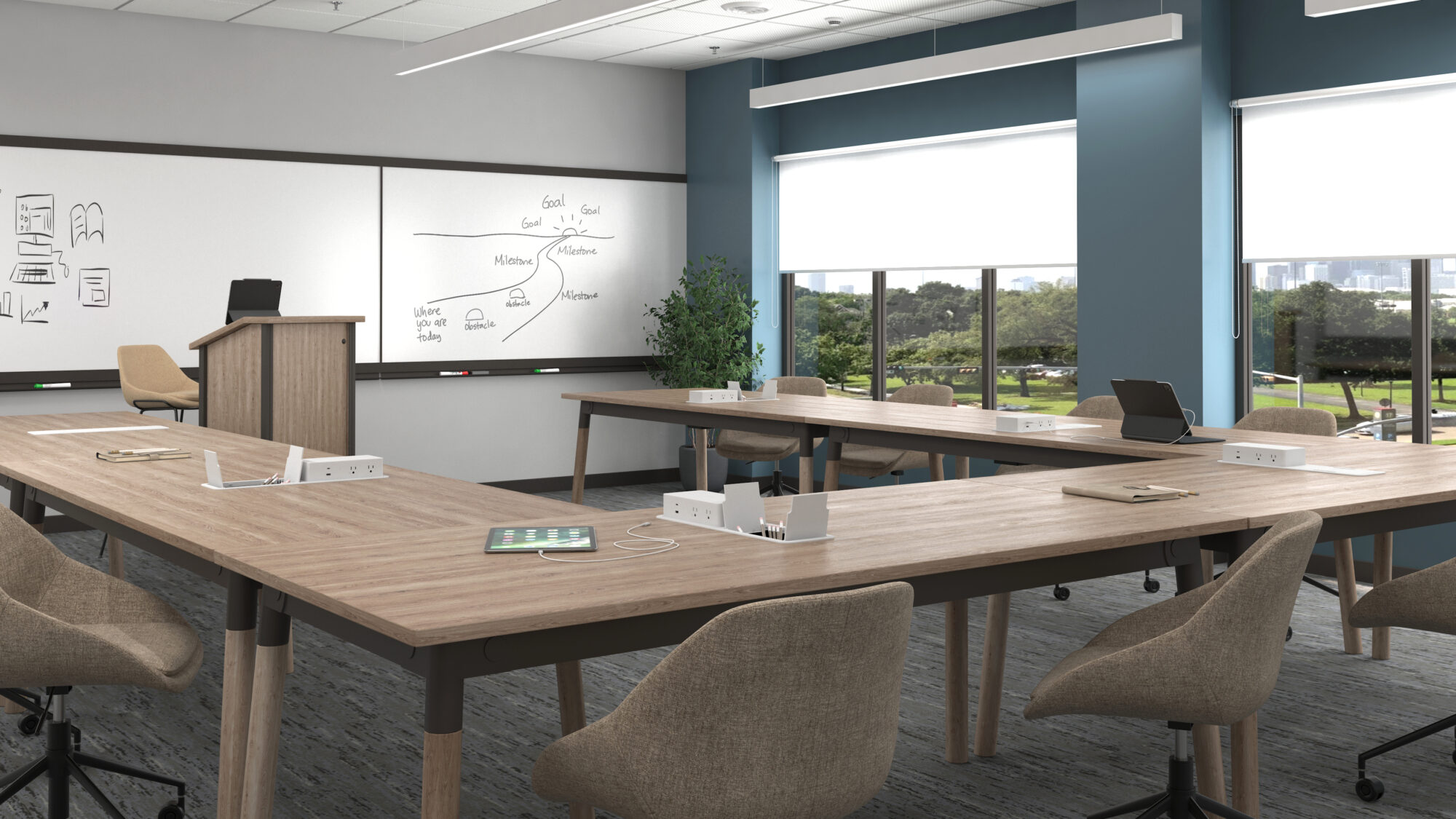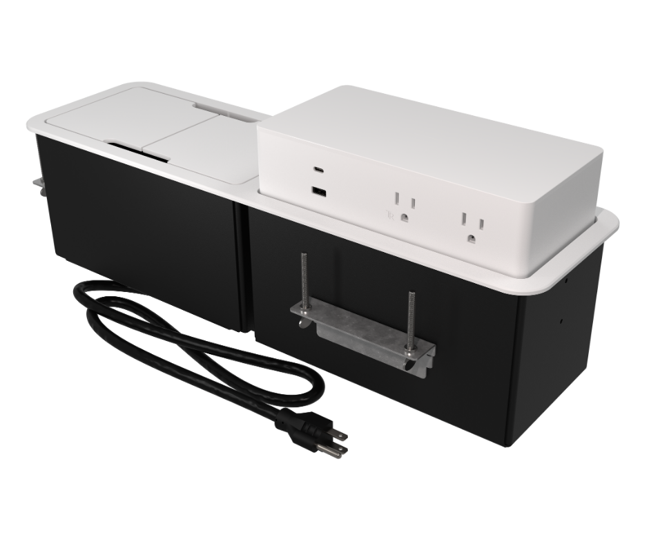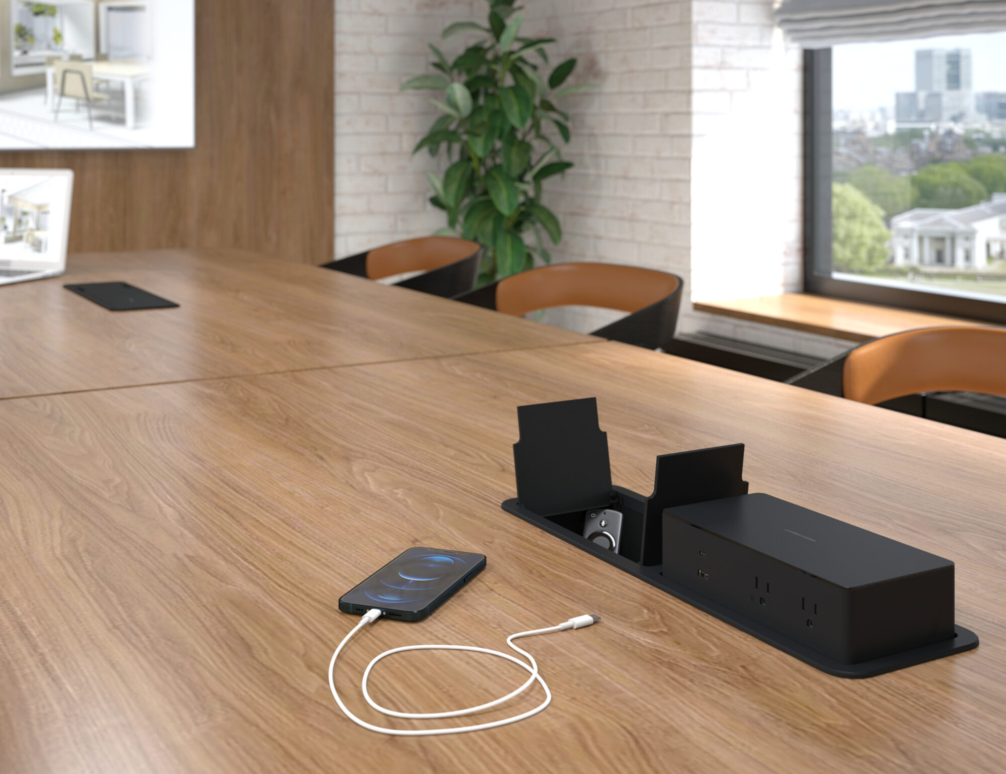 Introducing the premier conference and training room power solution, PeriscopeTM. Hiding beneath the surface of the table, PeriscopeTM boasts 60W of USB-C Power Delivery, USB-A, and Dual 15A Tamper-Resistant AC Power on each side. Simply press the top and watch Periscope effortlessly rise to the occasion. The actuating power center quietly raises and lowers with the press of a finger. Periscope seamlessly integrates capability, convenience, and aesthetics. Combine Periscope with its accompanying storage area to keep your power and cables unseen yet accessible.